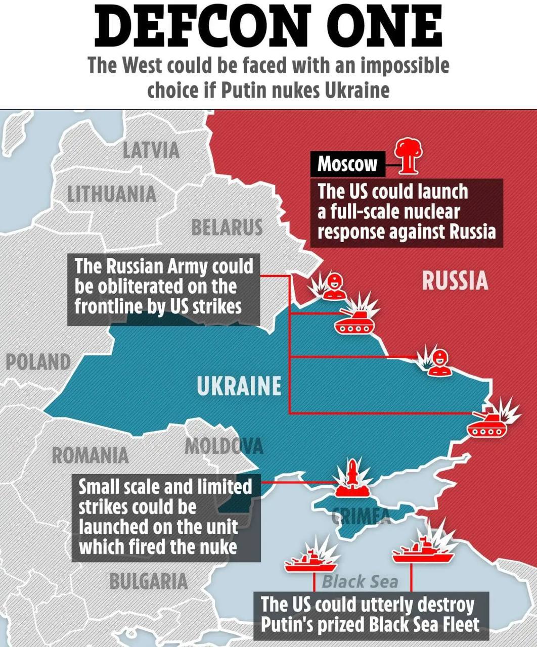 "Мы ответим общим усилием стран НАТО, которое уничтожит все неядерные силы России, которые мы сумеем разглядеть на украинском поле боя и в Крыму", - заявил он, уточнив, что это его личное мнение, а не официальная позиция стран НАТО и США.