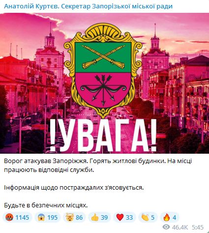 11.00 Секретарь Запорожского горсовета Анатолий Куртев подтвердил новые удары по городу.