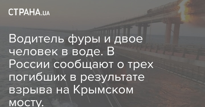 Следственный комитет РФ сообщает о трёх погибших в результате взрыва на Крымском мосту. Двое из них - это пассажиры ехавшей рядом со взорвавшимся грузовиком легковушки, из воды подняты тела мужчины и женщины.
