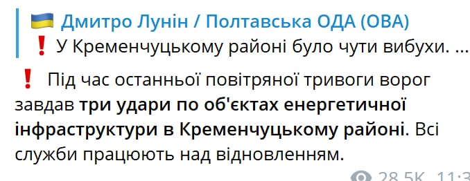 В районе Кременчуга Полтавской области во время сегодняшней воздушной тревоги было три удара по объектам энергетики.