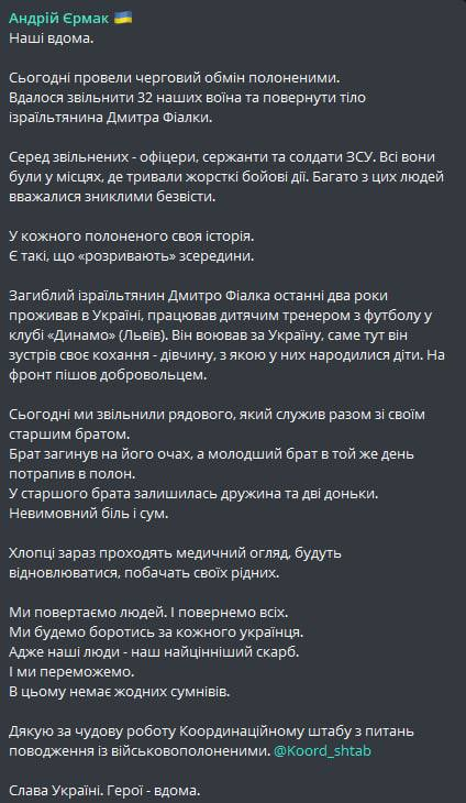 Также вернули тело израильтянина Дмитрия Фиалки, который воевал добровольцем за Украину.