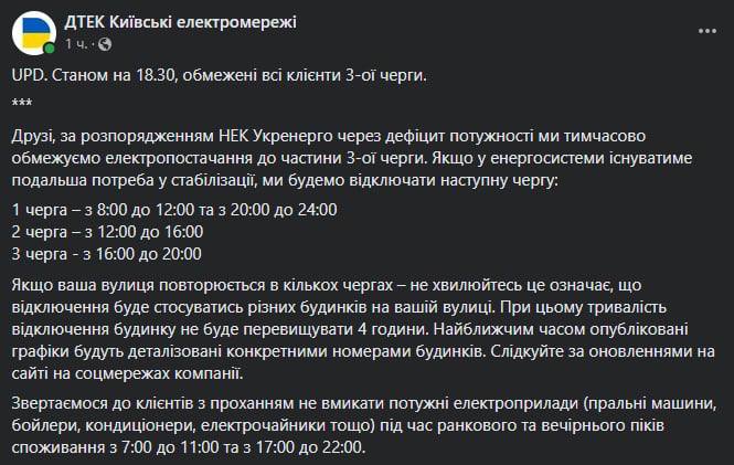Также появился график веерных отключений в Киеве с тремя очередями. Сейчас, как заявила КГГА, будут отключать третью очередь.