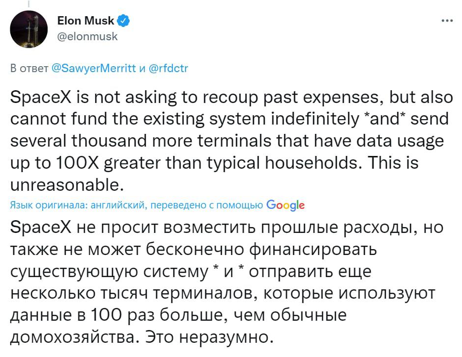 "SpaceX не требует возместить прошлые расходы, но и не может бесконечно финансировать существующую систему и, кроме того, направить еще несколько тысяч терминалов, которые используют в 100 раз больше данных по сравнению с обычными домохозяйствами. Это неразумно", - написал Маск в Twitter.