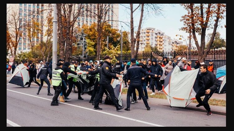 Митингующая оппозиция установила палатки на бульваре Стефана Великого, заблокировав движение по главной улице Кишинева. Движение транспорта было остановлено на участке между улицами Бэнулеску Бодони и Триколорулуй. В ответ силовики заблокировали протестующим проход на центральную площадь. Люди начали спорить с правоохранителями и кричать "Позор!".