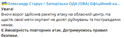 "Ночью враг совершил ракетную атаку на областной центр. Своей цели оккупанты не добились: разрушений и пострадавших нет", - заверил Старух.