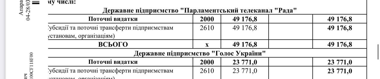 Еще 73 млн грн пойдет на освещение деятельности парламента через средства телевидения и радиовещания, а также на финансовую поддержку газеты "Голос Украины".