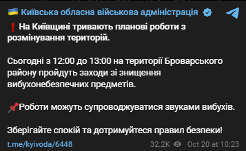 Жителей предупреждают, что с 12:00 до 13:00 на территории Броварского района пройдут мероприятия по уничтожению взрывоопасных предметов.