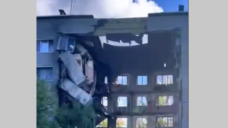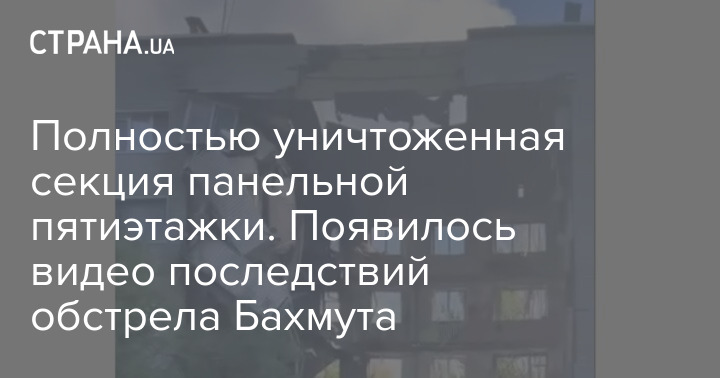 На видео можно заметить панельный пятиэтажный жилой дом с полностью уничтоженной центральной секцией.