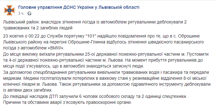 "23 октября в 00:22 в Службу спасения "101" поступило сообщение о том, что в селе Оброшино Львовского района на перегоне Оброшино-Глинная произошло столкновение скоростного пассажирского поезда с автомобилем ВМW. К месту вызова выехали спасатели 25-й государственной пожарно-спасательной части г. Пустомыты и 4-й государственной пожарно-спасательной части Львова", - говорится в сообщении.