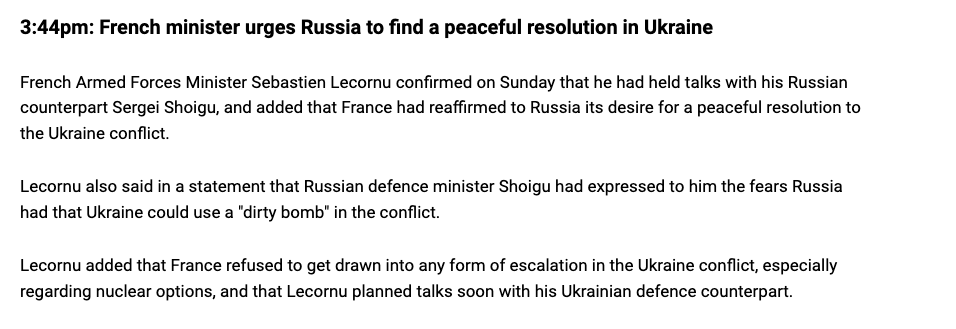 Париж подтверждает в пресс-релизе, что опасения России по поводу "нанесения украинцами удара грязной бомбой по их территории, по вине России" действительно были озвучены. В ответ Лекорню, по его словам, напомнил, что Франция не поддерживает "любую форму эскалации, особенно ядерную".