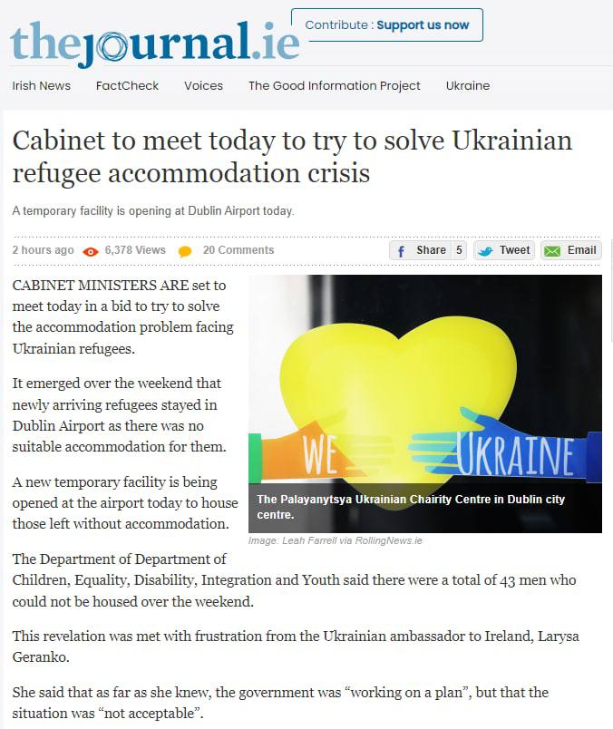 Правительство Ирландии сегодня соберется для решения "кризиса с размещением украинских беженцев". Беженцам не хватает жилья, на выходных в Ирландии не смогли найти убежище 43 украинца.