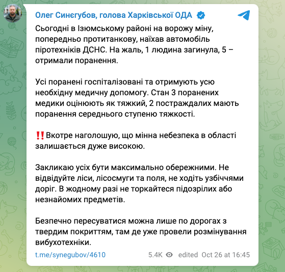 Напомним, что буквально неделю назад в том же Изюмском районе на мине также подорвался автомобиль с сотрудниками ГСЧС. Тогда погибли два человека, еще четверо получили ранения.