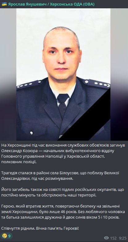 09.40 В Херсонской области во время разминирования погиб начальник взрывотехнического отдела ГУ Нацполиции в Харьковской области полковник Александр Козюра.