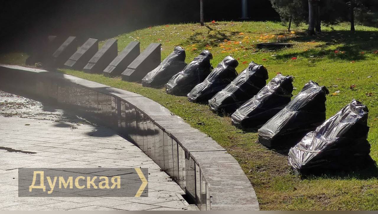 12.52 Мемориалы российских городов-героев на одесской Аллее Славы закрыли полиэтиленовыми черными пакетами.