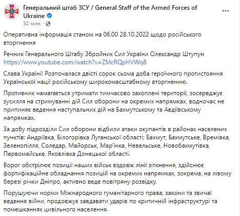 Генштаб Вооруженных Сил Украины обнародовал сводку о ситуации на фронте на утро 28 октября.