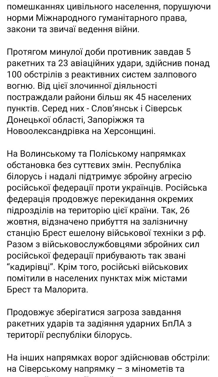 4. Российские военные продолжают прибывать в западную Беларусь. 26 октября в Брест прибыл эшелон военной техники из России. Российские военные были замечены в населенных пунктах между Брестом и Малоритой (ближе к границе с Волынской областью Украины).