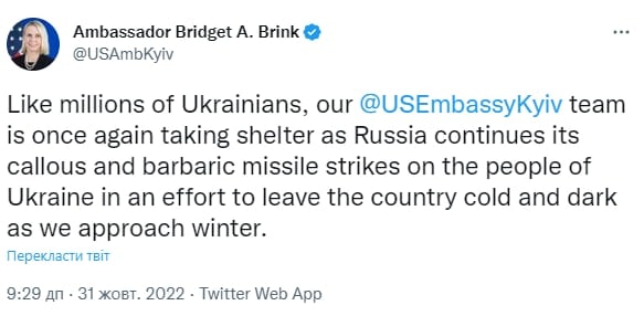 "Как и миллионы украинцев, наша команда снова находится в укрытии, поскольку Россия продолжает свои бессердечные и варварские ракетные удары по народу Украины, пытаясь погрузить страну в холод и темноту по мере приближения зимы", - написала Бринк в Twitter.