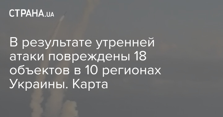 Премьер-министр Украины Денис Шмыгаль заявил о 18 поврежденных объектах Украины в десяти регионах в результате сегодняшней атаки российских войск. Большинство атакованных объектов - энергетические.