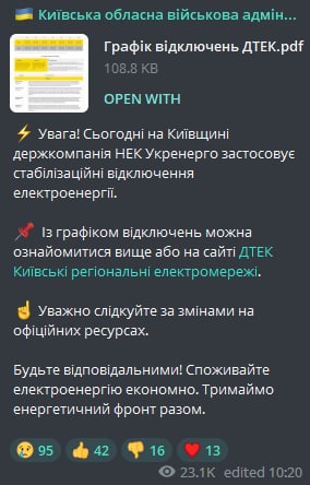 В Киевской области компания "Укрэнерго" применяет стабилизационные отключения, сообщает областная военная администрация.