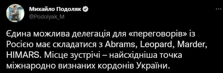 "Единственная возможная делегация для "переговоров" с Россией должна состоять из Abrams, Leopard, Marder, HIMARS. Место встречи – самая восточная точка международно признанных границ Украины", - написал Подоляк.