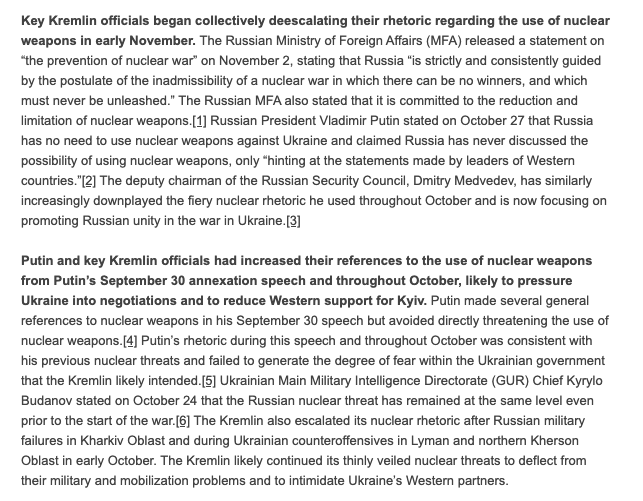 Кремль может в будущем использовать риторические методы балансирования на грани ядерной войны, чтобы побудить Соединенные Штаты и их союзников оказать давление на Украину для ведения переговоров, но не сможет напрямую заставить Киев вести переговоры посредством ядерных угроз, говорится в отчете.