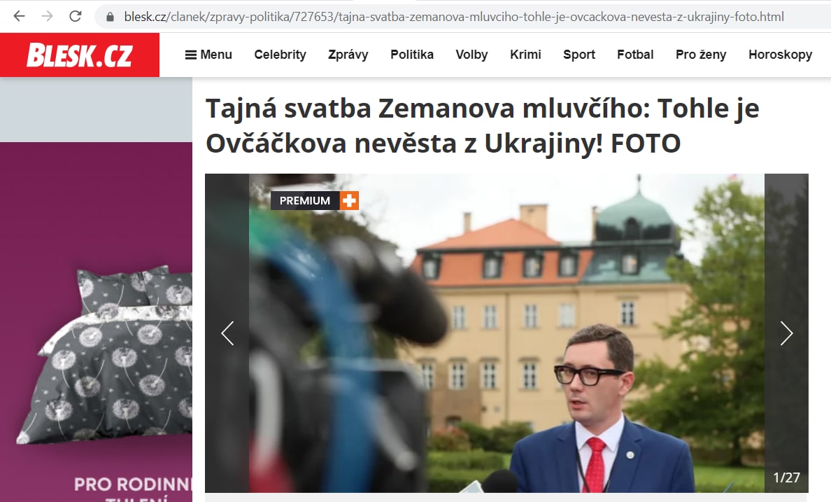 09:16 Пресс-секретарь президента Чехии Иржи Овчачек на прошлой неделе женился на украинке, которую он приютил в рамках программы помощи беженцам, сообщает чешский таблоид Blesk.