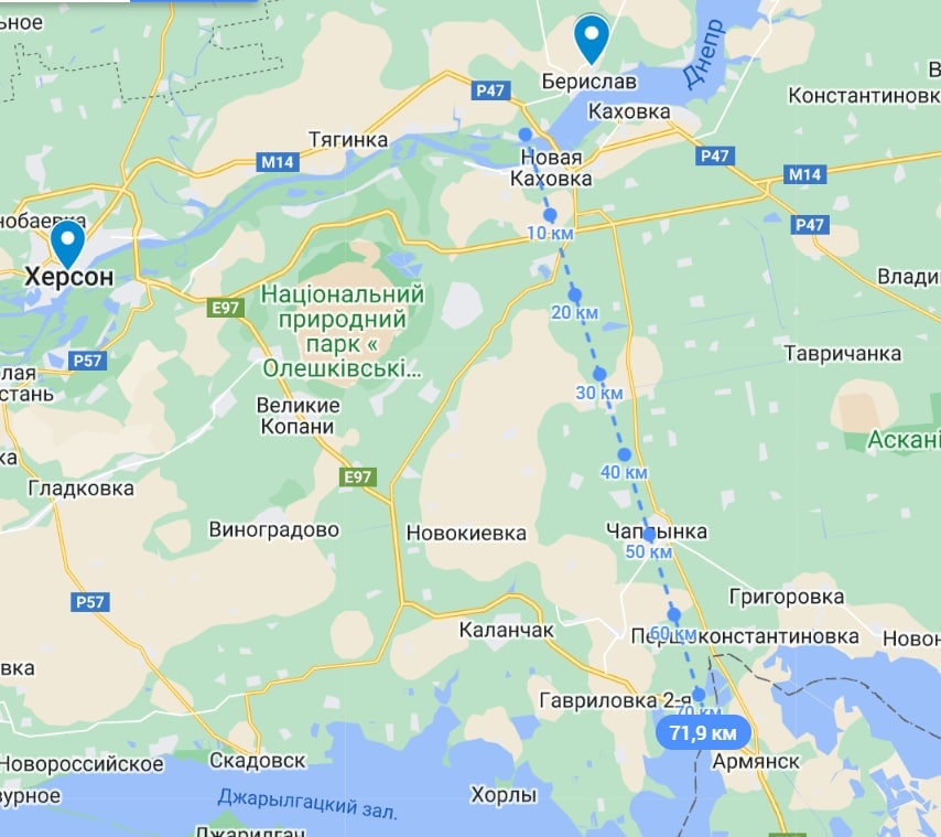 Добавим, что если россияне покинут правый берег Днепра, то граница Крыма и материка будет на расстоянии примерно 72 километров от ближайших позиций ВСУ. При этом дальность ракет MFOM для HIMARS достигает 80 километров.