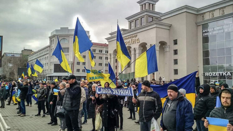 Жители Херсона празднуют освобождение города. В центре люди скандируют: "ВСУ".