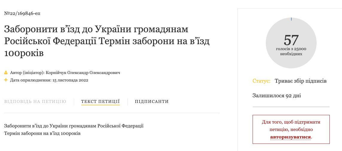 Напомним, что летом подобная петиция уже набирала необходимые 25 тысяч голосов. В ответ на нее президент Владимир Зеленский заявил, что Украина ввела визовый режим с РФ.