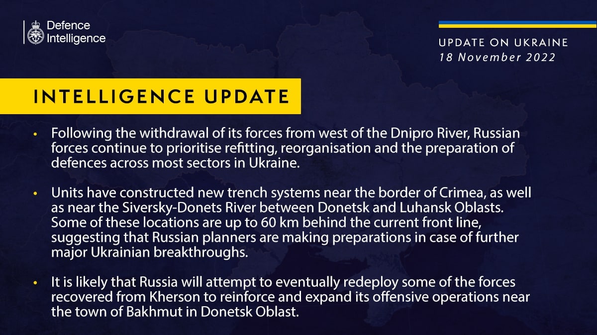 В новой сводке разведка Британии сообщает, что после вывода своих войск с правобережья Днепра российские силы продолжают уделять приоритетное внимание переоснащению, реорганизации и подготовке обороны на большинстве участков Украины.
