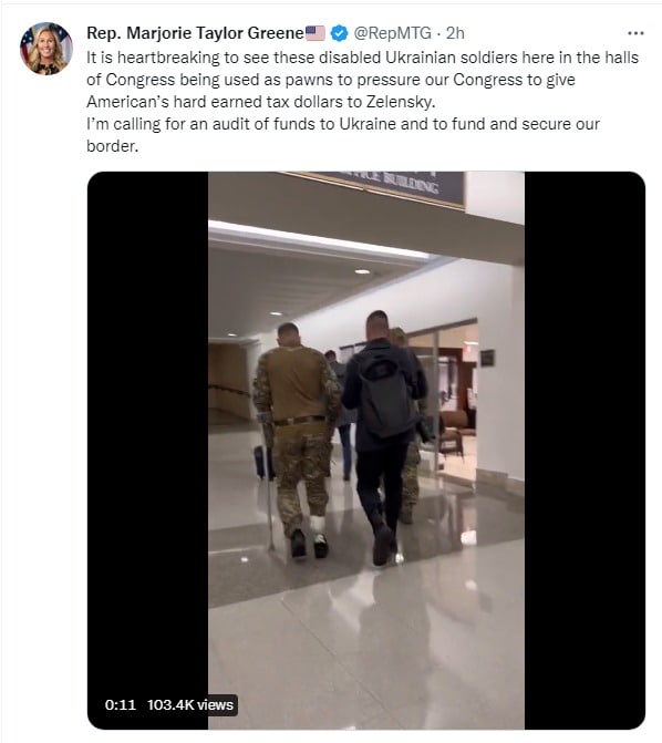 "Душа разрывается смотреть на этих украинских солдат-инвалидов здесь, которых в залах Конгресса используют в качестве пешек, чтобы заставить наш Конгресс отдать Зеленскому с трудом заработанные американцами налоговые доллары. Я призываю к проверке средств, поступающих в Украину, а также для финансирования и обеспечения безопасности нашей границы", - написала Грин.