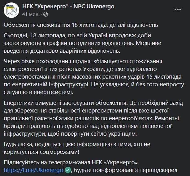Об этом сообщает Укрэнерго в своем тг-канале.