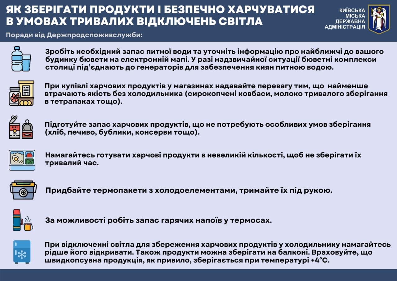 10:18 Управление Госпотребслужбы Киева разъясняет, как хранить продукты и безопасно питаться во время длительных отключений света:
