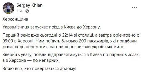 Хлань также сообщил, что поезда будут отправляться из Киева по четным числам, а из Херсона - по нечетным.