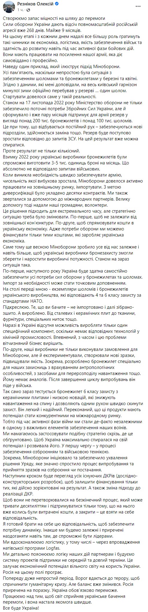 "Во-первых, в следующем году Украина будет способна самостоятельно обеспечить все потребности Сил обороны в бронежилетах и ​​шлемах. Импорт при необходимости может стать точечным дополнением", - написал Резников.