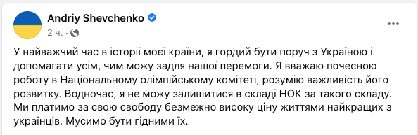 "В самое тяжелое время в истории моей страны, я горд быть рядом с Украиной и помогать всем, чем могу ради нашей победы. Я считаю почетной работу в Национальном олимпийском комитете, понимаю важность его развития. В то же время, я не могу остаться в составе НОК при таком составе. Мы платим за свою свободу безгранично высокую цену жизнями лучших из украинцев. Должны быть достойны их", - заявил Шевченко.
