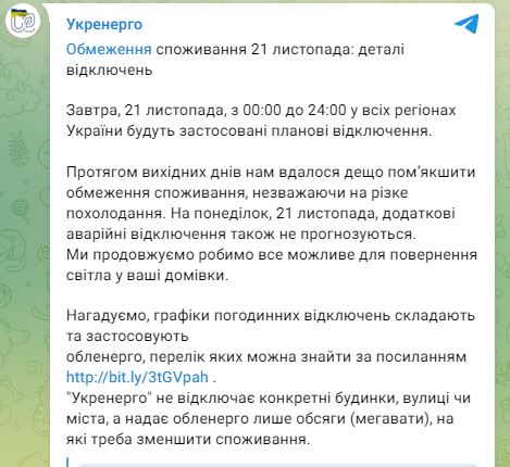 В понедельник, 21 ноября, во всех регионах запланированы плановые отключения электроэнергии. Дополнительные аварийные отключения пока не прогнозируются.