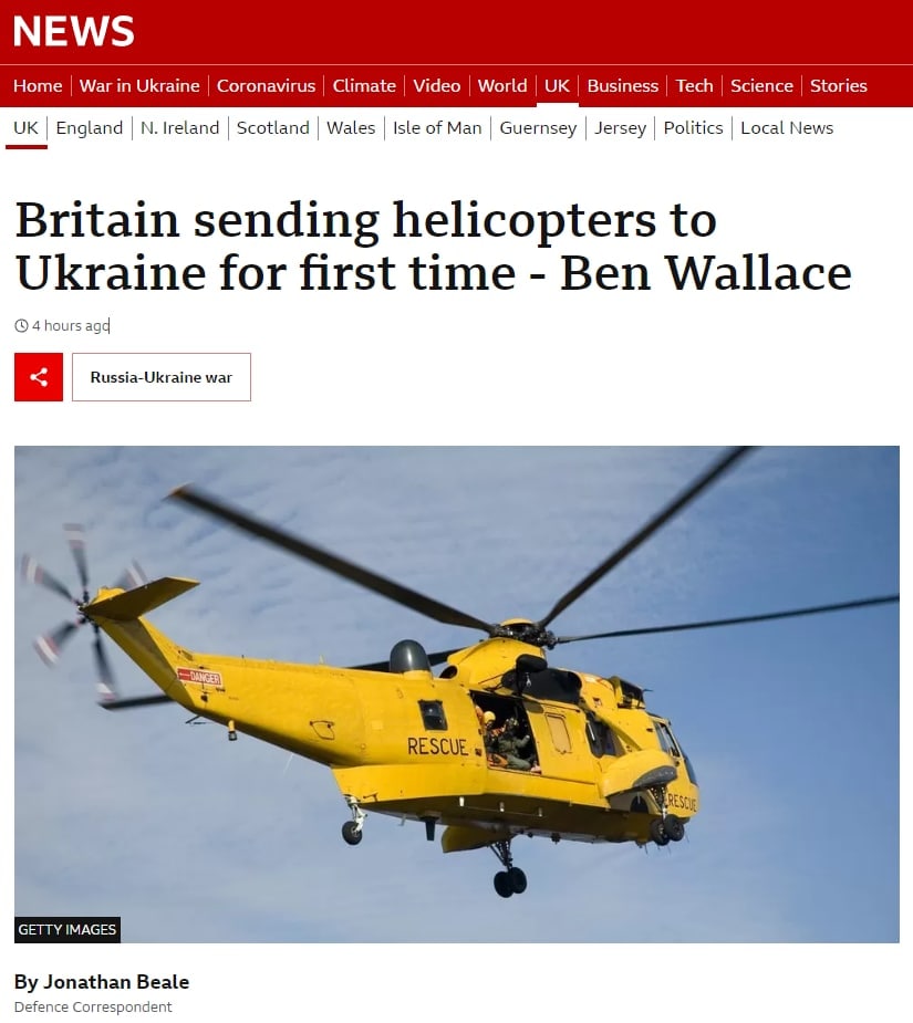 09.20 Британия передаст Украине три вертолета Sea King и 10 тысяч артиллерийских снарядов, сообщил министр обороны Британии Бен Уоллес.