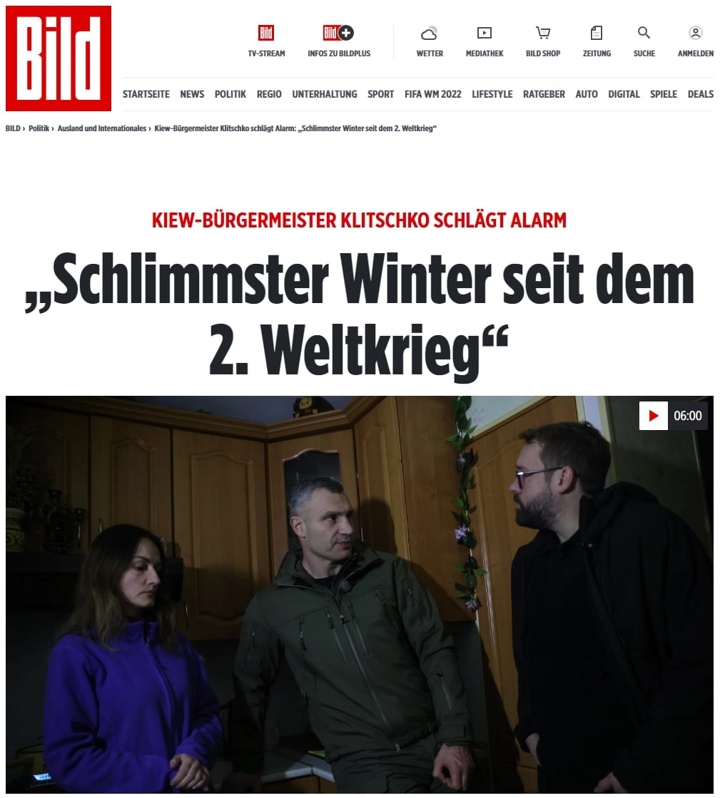 В западной прессе уже идут сомнения в том, что Европа может справиться с обрушением украинской энергетики. Украинские же представители транслируют на Запад крайне апокалиптические мессиджи. Кличко в интервью Bild заявил, что Киев может ждать "худшая зима со времен Второй мировой войны" и, возможно, "придется эвакуировать часть города".
