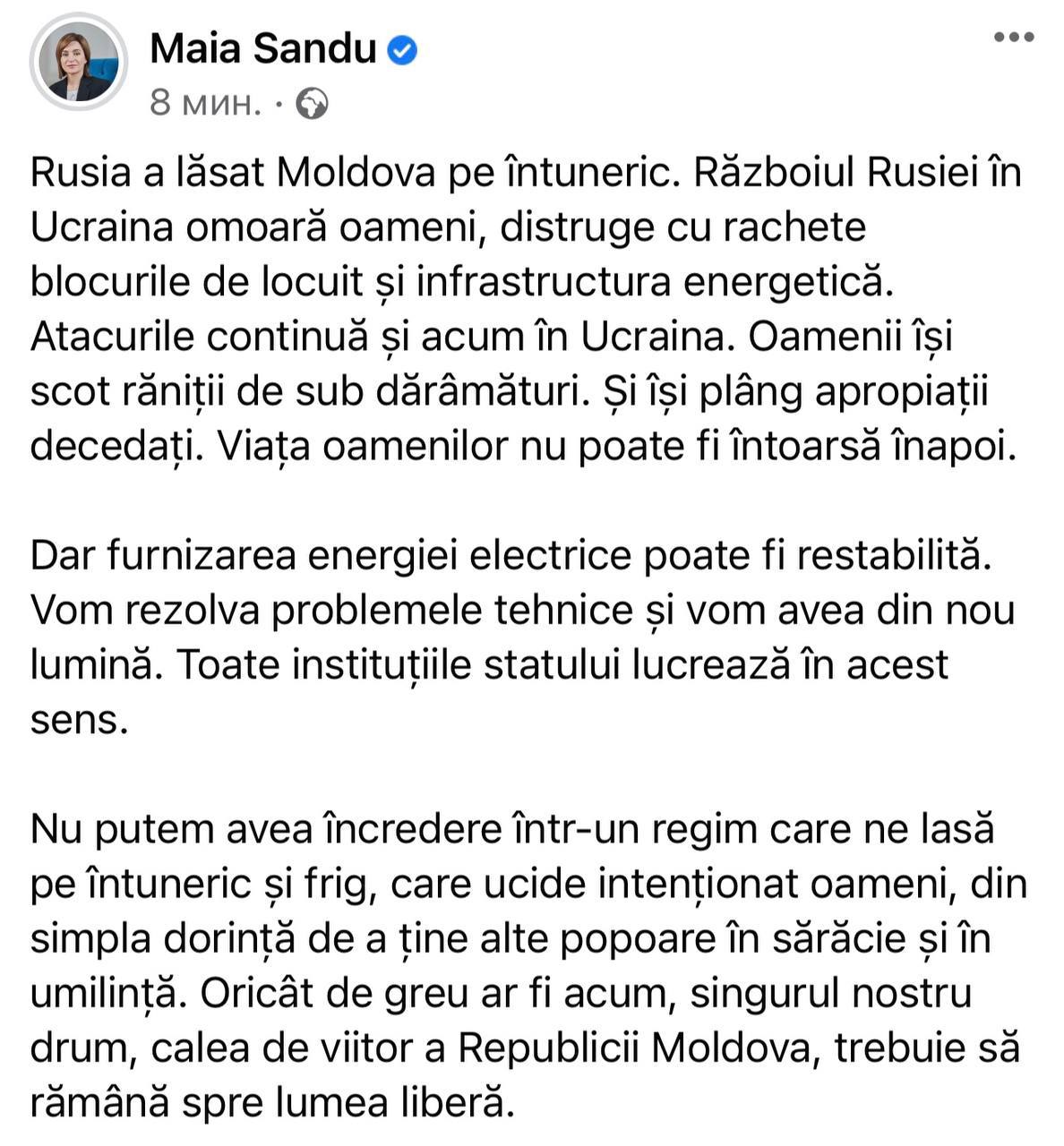 Ранее по всей Молдове пропал свет после новых ракетных обстрелов Украины.