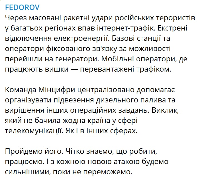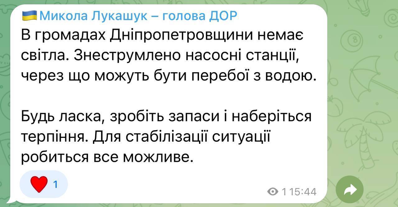 Ранее в Офисе президента заявили, что свет начнут восстанавливать с завтрашнего утра.