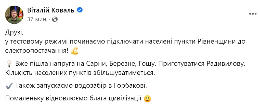 22:33 В Киевской области подключено 20% потребителей, в Киеве подключают критическую инфраструктуру, заявил Кирилл Тимошенко.