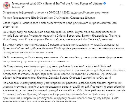 07.35 Генштаб ВСУ опубликовал сводку о ситуации на фронте на утро 23 ноября.