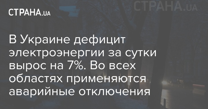 В Украине стремительно растет дефицит электроэнергии, сообщает Укрэнерго. Сегодня он составляет 27%, а вчера был - 20%.