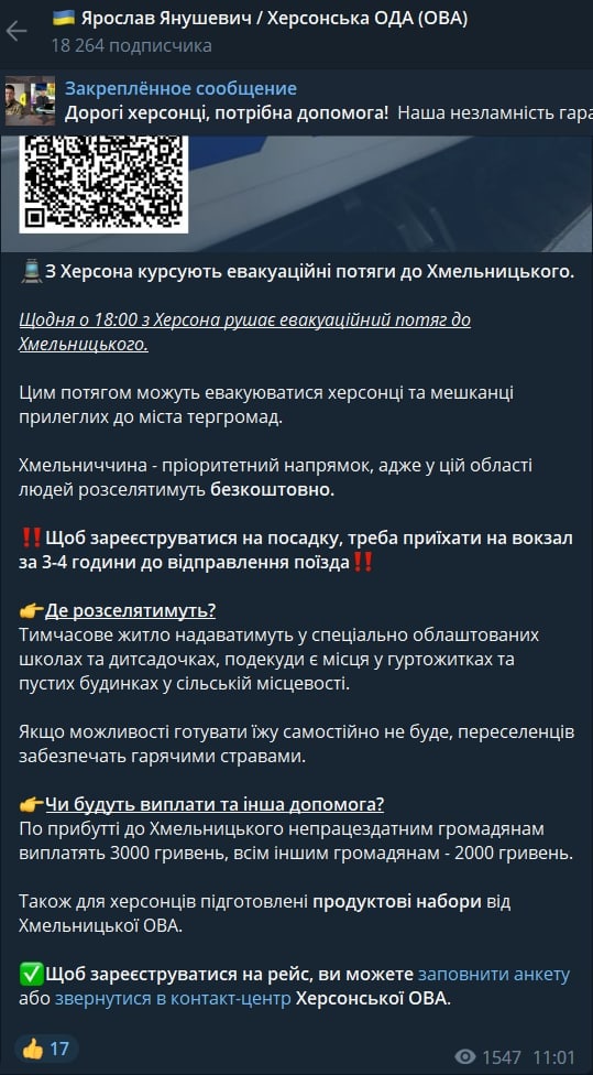 Из Херсона в Хмельницкий каждый вечер отправляется эвакуационный поезд. Регистрация - за 4 часа до отправления