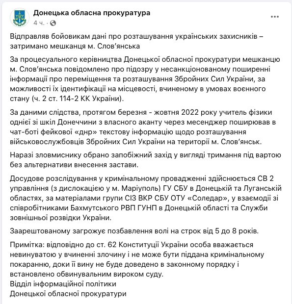 По данным следствия, в течение марта – октября 2022 года мужчина через мессенджер передавал в чат-бот т.н. "ДНР" текстовую информацию о расположении украинских военных в Славянске.
