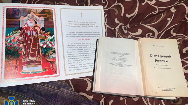 В Фейсбуке спецслужбы утверждается, что "на территории епархий обнаружены склады с прокремлевской литературой, нацистская символика, "учение о сатанизме" и тексты молитв о московском патриархе Кирилле".