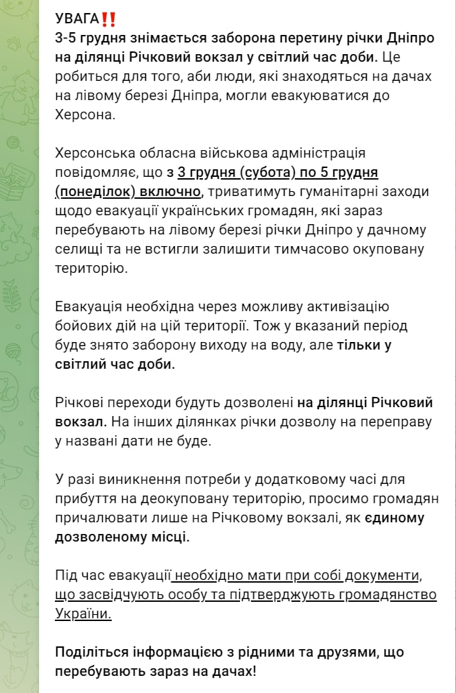 Речь об "эвакуации украинских граждан, которые находятся на левом берегу реки Днепр в дачном поселке и не успели покинуть временно оккупированную территорию".