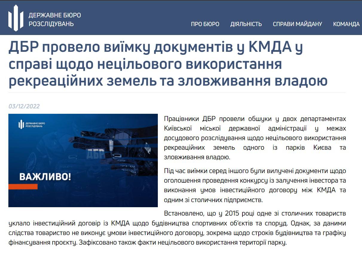 12:47 Госбюро расследований сообщило, что провело обыски в двух департаментах Киевской городской администрации. Это происходит в рамках досудебного расследования нецелевого использования рекреационных земель одного из парков Киева и злоупотребления властью.