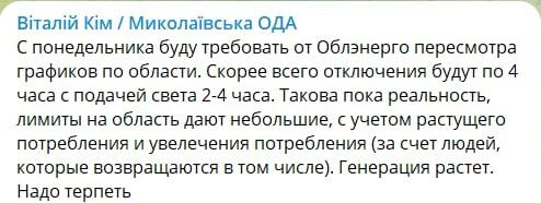 "Буду требовать от "Облэнерго" пересмотра графиков по области. Скорее всего отключения будут по 4 часа с подачей света 2-4 часа. Такова пока реальность, лимиты на область дают небольшие, с учетом растущего потребления и увеличения потребления (за счет людей, которые возвращаются в том числе). Генерация растет. Надо терпеть", - призывает Ким в телеграм-канале.
